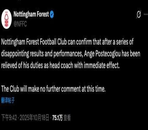 巧合的是,诺丁汉森林宣布解雇波斯特科格鲁的公告正好用了39个单词。