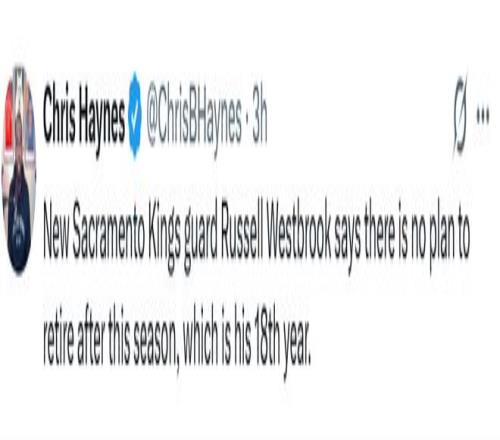 雷速体育10月20日宣 据名记Chris Haynes报道,国王新援卫威斯布鲁克在接受媒体采访时表示,目前并无在本赛季结束后退役的打算。