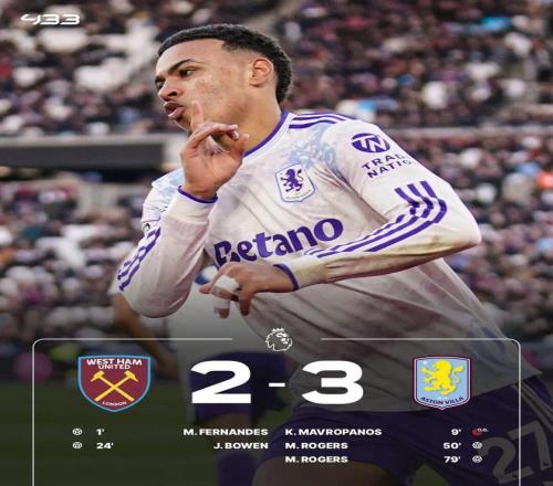 下半场,摩根-罗杰斯梅开二度,维拉在客场逆转击败西汉姆联。