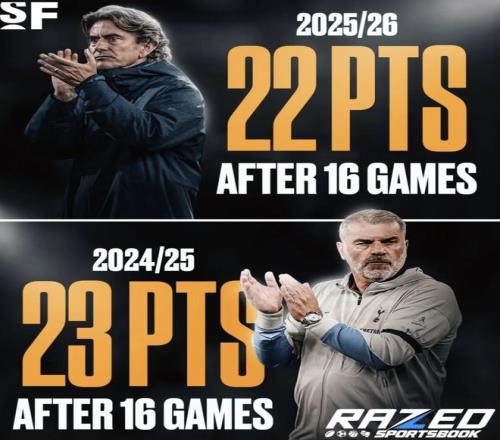 不仅如此,相比上赛季,热刺本赛季英超前16轮战绩为6胜4平6负,目前积22分排名第11位。