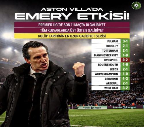 埃梅里的球队上一次没赢球是英超第10轮客场0-2不敌利物浦,那也是维拉最近11场英超的唯一失利(10胜1负)。