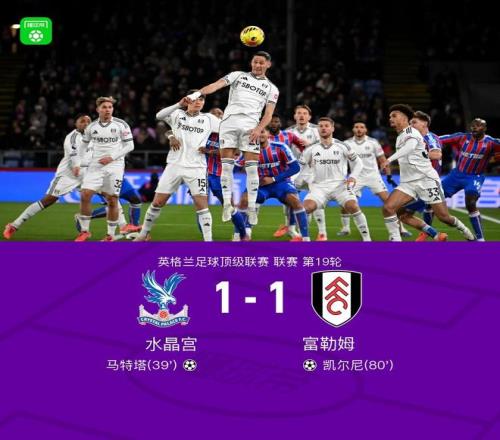 北京时间1月2日,英格兰足球超级联赛第19轮,水晶宫坐镇主场迎战富勒姆。比赛中,克莱因送出精准助攻,马特塔抓住机会率先破门,为水晶宫取得领先。下半场,萨萨-卢基奇成功策动进攻,凯尔尼完成破门,帮助富勒姆扳平比分。最终双方以1比1握手言和。