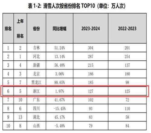 浙江滑雪人次在全国省份排名第六。(图/《2023—2024中国滑雪产业白皮书》截图)